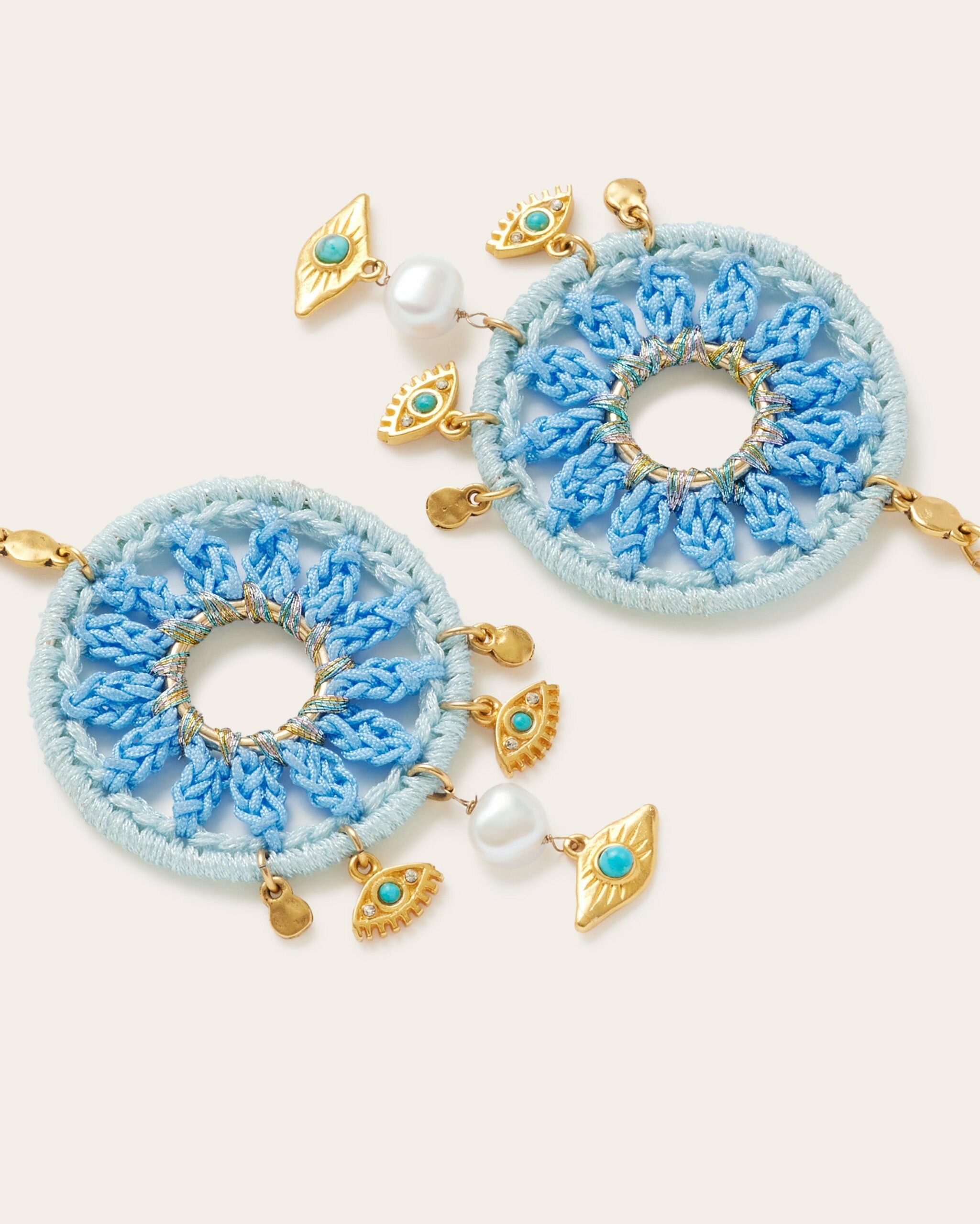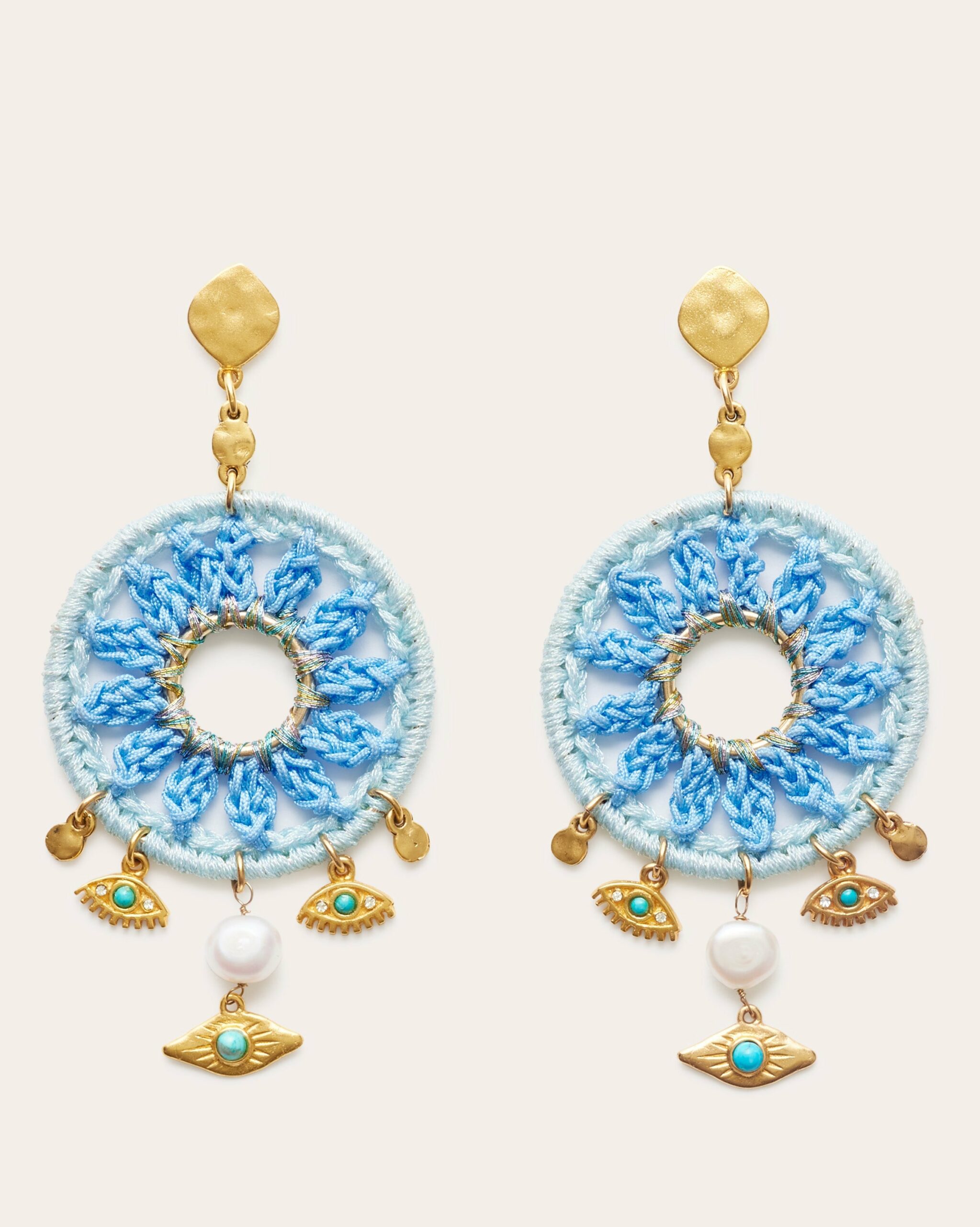 Enhance any look with the addition of the Kira Earrings, woven with a multi toned thread base. Adorned with evil eyes complete with turquoise details designed to bring the wearer luck, the freshwater pearls add a sweet touch to this beautiful pair. This is a capsule collection designed with Sequin, a female-founded jewelry brand based in New York City. Product Details – Metal Post–Evil Eye Castings Feature Turquoise Cabochon– Freshwater Cultured Pearl (Farm Raised)– Length: 3 1/2″– Handmade in New York & Rhode Island– Style Exclusive Care Instructions – Clean your jewelry with a soft, dry cloth that is free of any liquids or chemicals.– When applying lotions, perfumes and cosmetics, allow to completely dry before putting on your jewelry.– Avoid wearing your jewelry in the shower, swimming and in other water activities.– Store your jewelry in your jewelry box. Free Delivery & Easy Returns We offer free ground shipping on all U.S. orders and free returns within 30 days on all eligible merchandise. See more details here.
