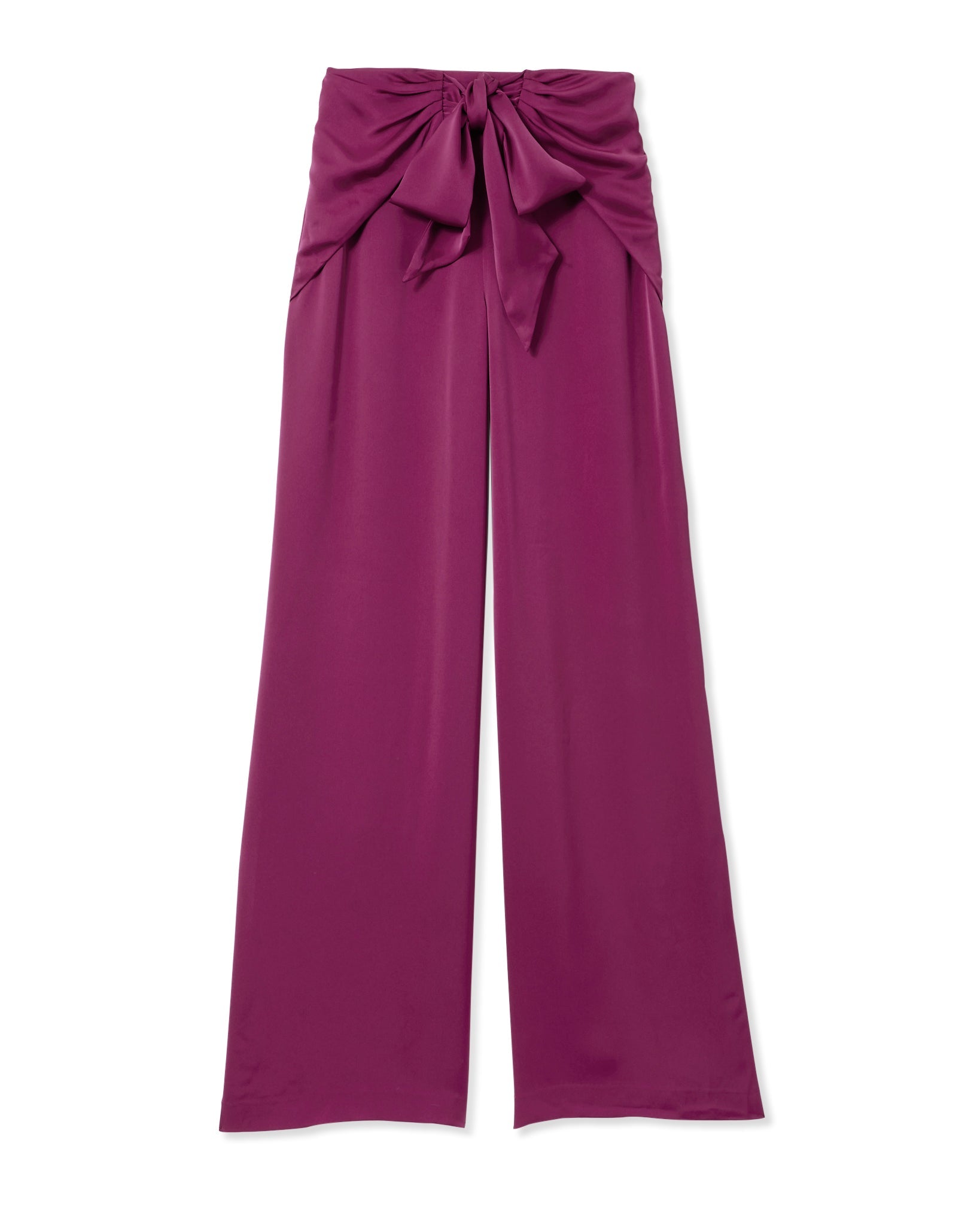 Our mystical Exclusive Margo Pant delivers an unexpected spin on a classic silhouette. Crafted with silky satin charmeuse, these luxe trousers have a contemporary tie at the waist that contrasts beautifully against the long, loose trouser. Wear with a fitted top for your next upscale dinner and you’ll feel like a million bucks. This style is sold exclusively at Ramy Brook. Size & Fit – This style runs small, we suggest sizing up. – Model is Wearing Size 0– Model is 5’9″ Size Guide Details & Care – Satin Charmeuse– 100% Polyester– Dry Clean or Hand Wash– Style #: A0222516– Style Exclusive Free Delivery & Easy Returns We offer free ground shipping on all U.S. orders and free returns within 30 days on all eligible merchandise. See more details here.